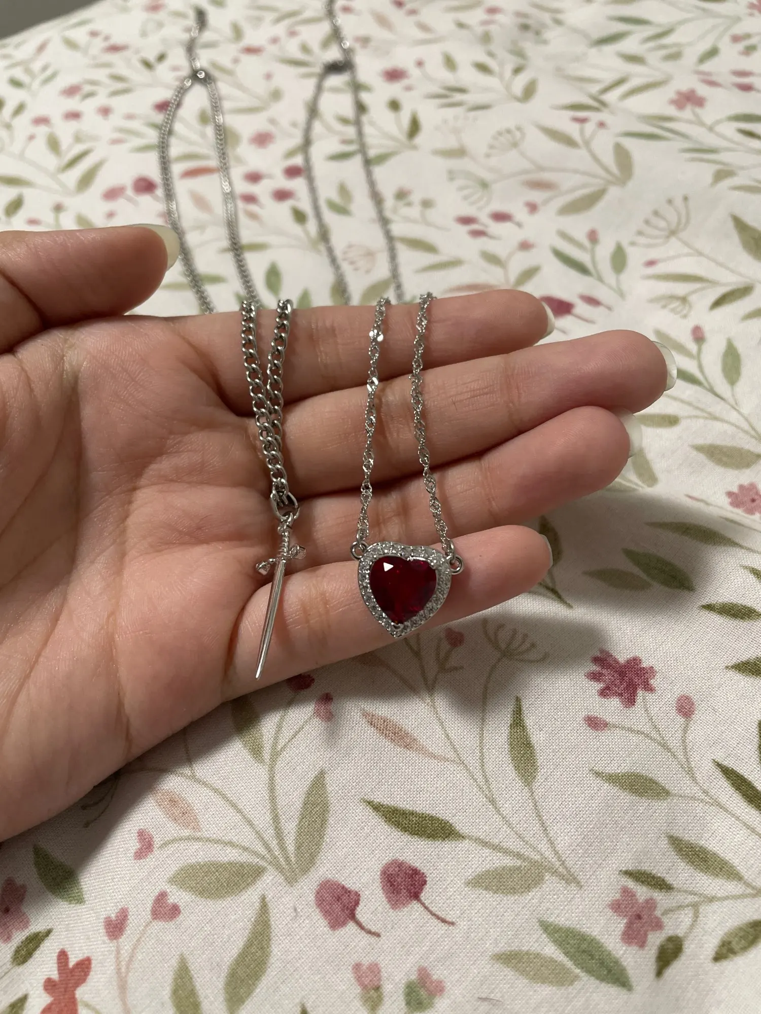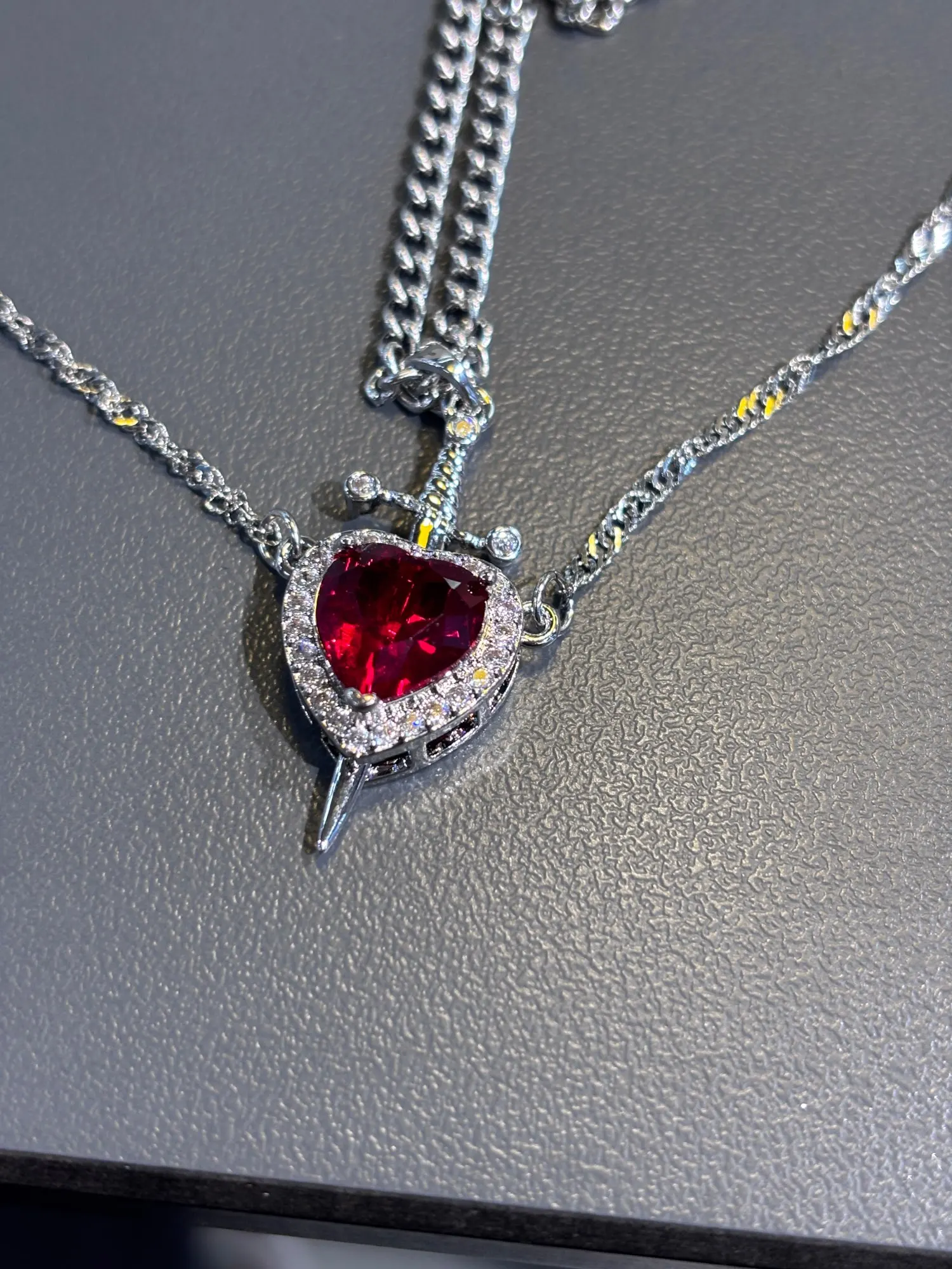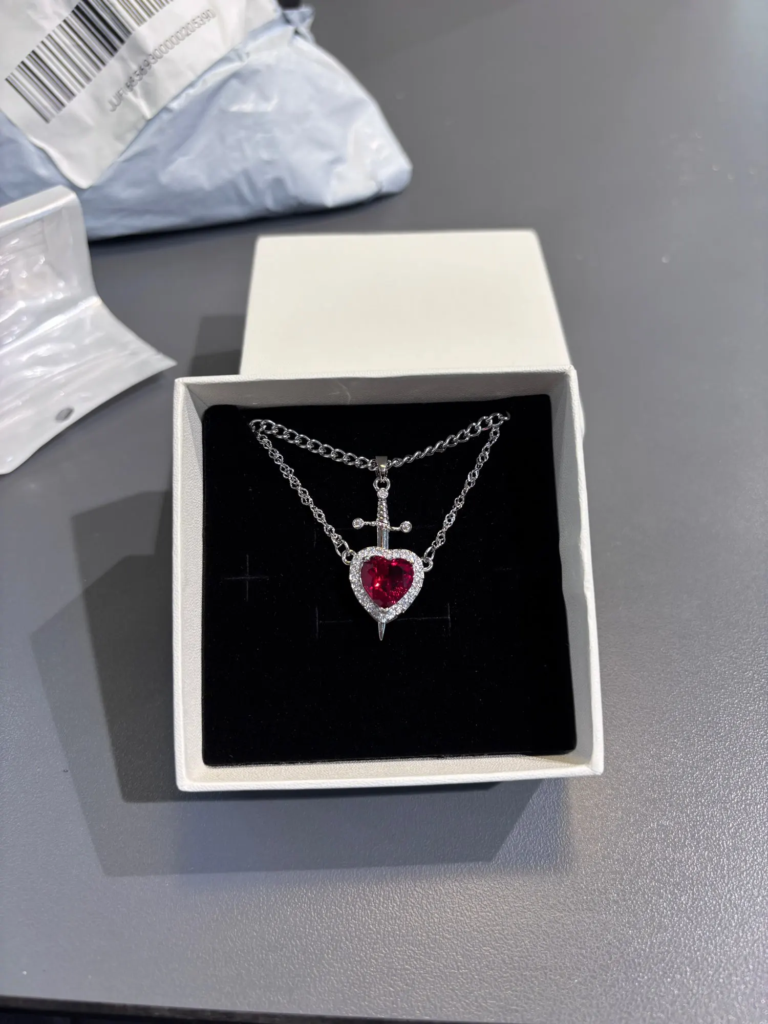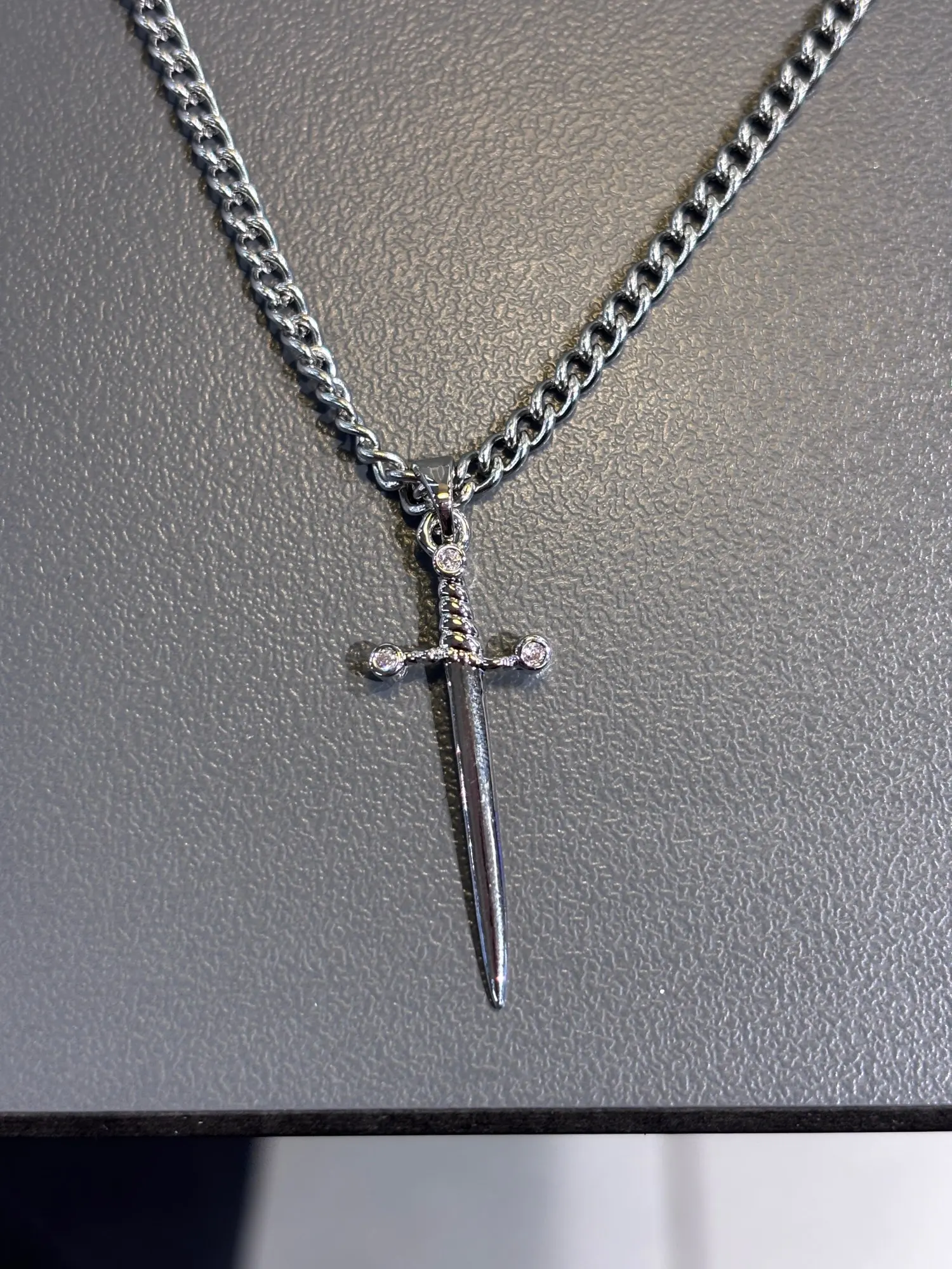 Material: STAINLESS STEEL+crystal Heart: 1.5cm Sword: 3.5cm Water wave chain for women: 45+5cm extension chain LInk chain for men: 50+5cm extensionchain